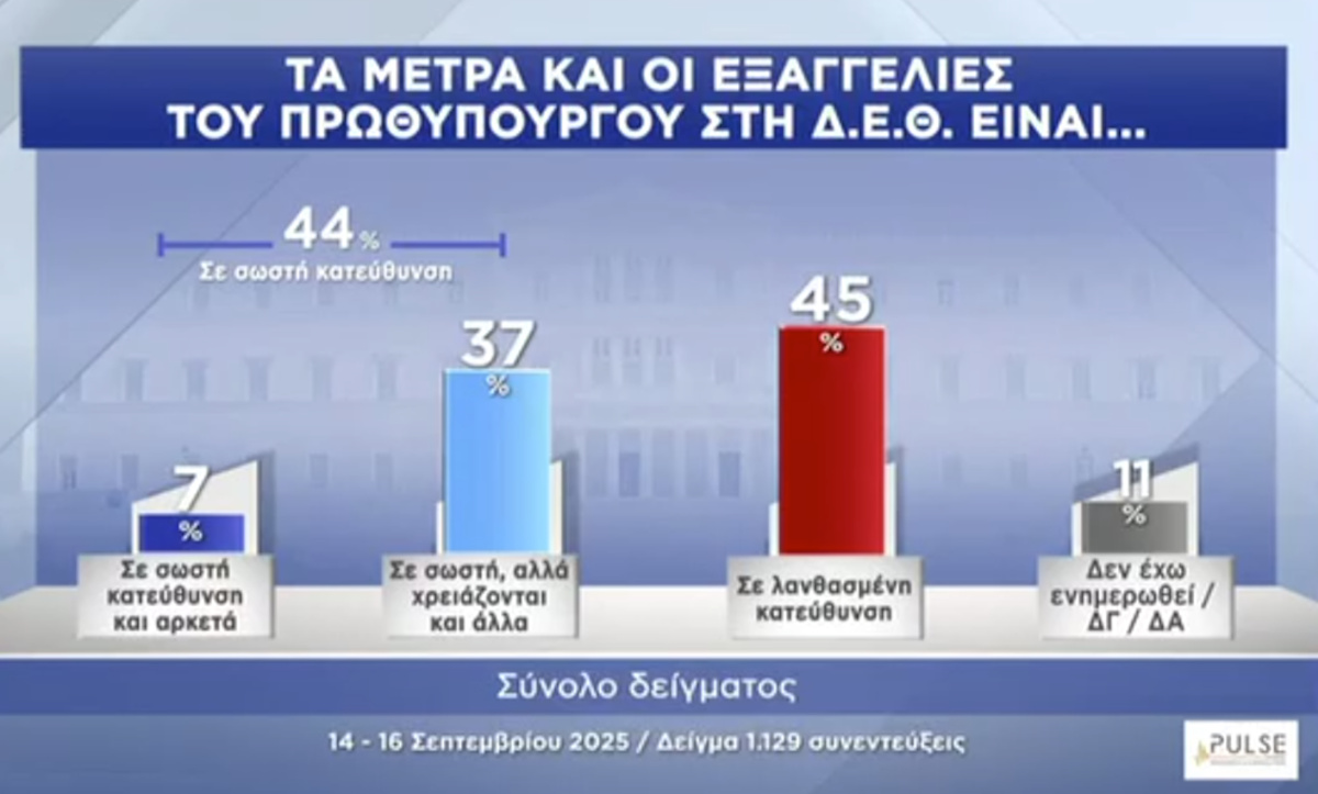 Στην ερώτηση πώς εκλαμβάνουν τα μέτρα της κυβέρνησης που εξήγγειλε ο Κυριάκος Μητσοτάκης στη ΔΕΘ, το 45% των ερωτηθέντων απαντά πως κινούνται σε λανθασμένη κατεύθυνση, 37% στη σωστή, αλλά χρειάζονται κι άλλα, ενώ ένα 7% αναφέρει πως είναι αρκετά.