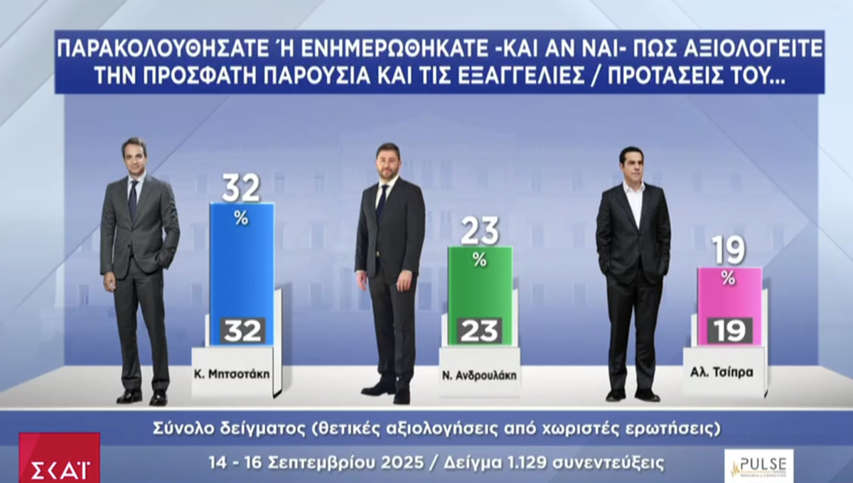 Μόλις μισή μονάδα πάνω εμφανίζεται η Νέα Δημοκρατία μετά τις εξαγγελίες του πρωθυπουργού στη ΔΕΘ, σύμφωνα με τη νέα δημοσκόπηση της Pulse, η οποία παρουσιάστηκε στο κεντρικό δελτίου ειδήσεων του ΣΚΑΪ.