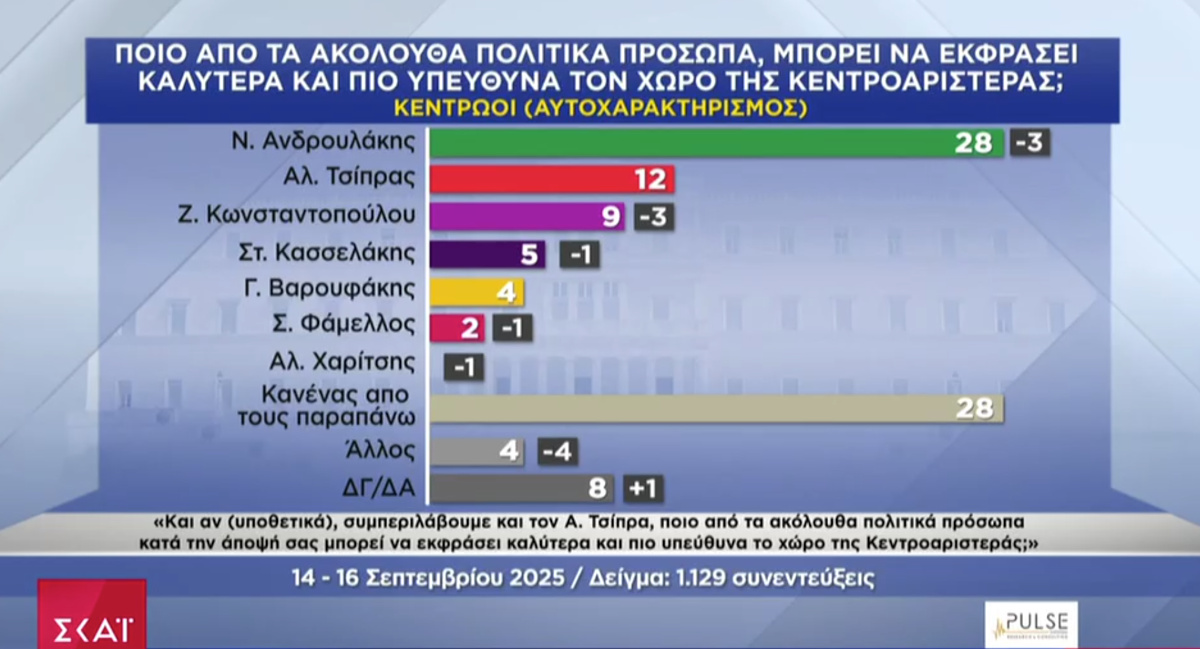 Σε όσους αυτοχαρακτηρίζονται κεντρώοι ο Νίκος Ανδρουλάκης καταλαμβάνει την πρώτη θέση σε ποσοστό 28% (12% έχει ο πρώην πρωθυπουργός), ενώ στους κεντροαριστερούς ο Αλέξης Τσίπρας βρίσκεται στην πρώτη θέση των προτιμήσεων με 28% (έναντι 19% του προέδρου του ΠΑΣΟΚ).