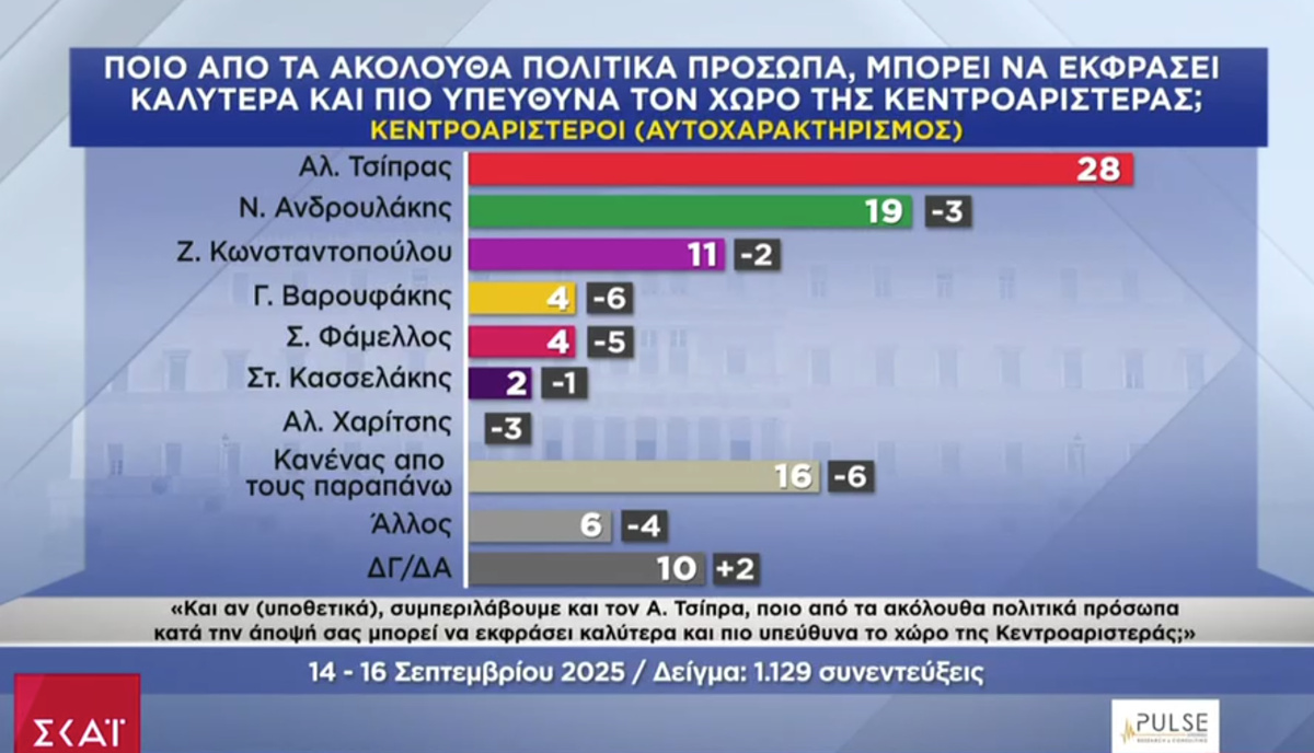 Ωστόσο, όταν μπαίνει και το όνομα του Αλέξη Τσίπρα, ο πρώην πρωθυπουργός συγκεντρώνει το μεγαλύτερο ποσοστό με 16%, ως το πρόσωπο που μπορεί να εκφράσει καλύτερα και πιο υπεύθυνα τον συγκεκριμένο πολιτικό χώρο, ενώ ο Νίκος Ανδρουλάκης υπολείπεται δύο μονάδων.